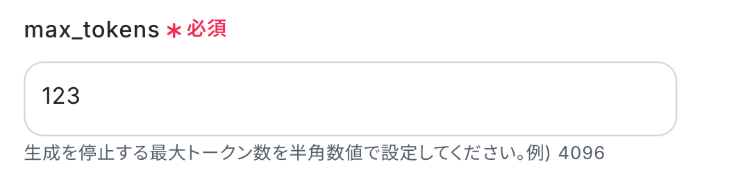 「max_tokens」は、デフォルトで設定されていますが、入力欄下の注釈を参照して直接入力してください。