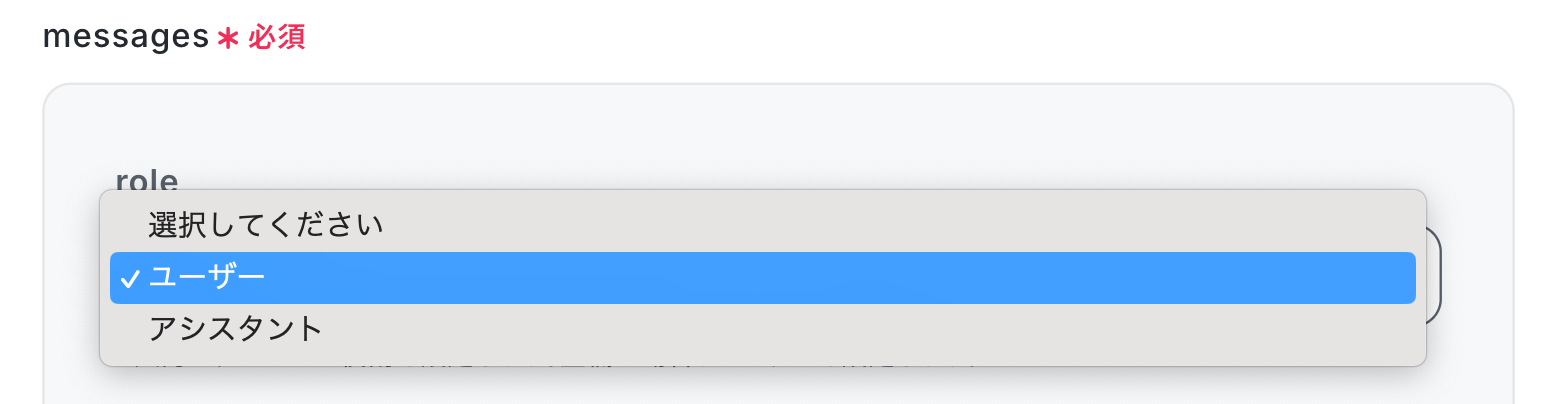 「role」は、「ユーザー」のままで問題ありません。 システム的な指示やAIの応答を定義したい場合はプルダウンから「アシスタント」を設定することも可能です。