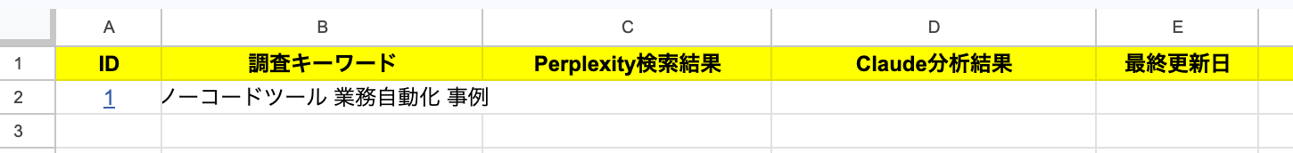 前準備:Google スプレッドシートを用意する PerplexityとAnthropic(Claude)で解析した結果をGoogle スプレッドシートに反映させるため、以下のシートを用意しました。 以下を参考にして、シートを準備してください。 「調査キーワード」列は必ず設定しましょう!