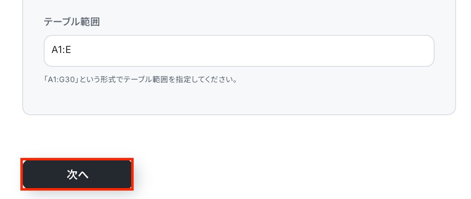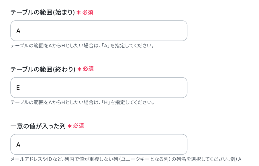 テーブル範囲 を設定していきます。 ここではステップ2で用意した以下のシートを使用するので、テーブル範囲の始まりは「A」、テーブル範囲の終わりは、「E」です。 一意の値が入った列(列内で値が重複しない列)は、「A」になります。