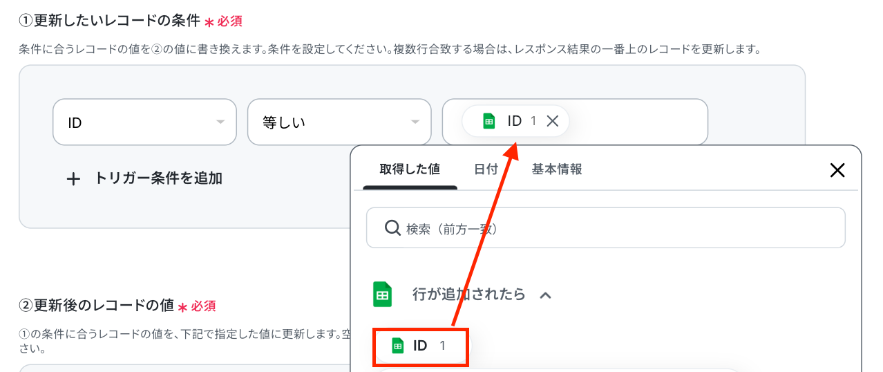 次の画面で、「更新したいレコードの条件」 を設定してください。 ここで指定した条件に合致した場合のみ、レコードの更新を行います。 今回は、「ID」がGoogle スプレッドシートのトリガー設定で取得した値の「ID」と等しい場合に更新するよう設定します。