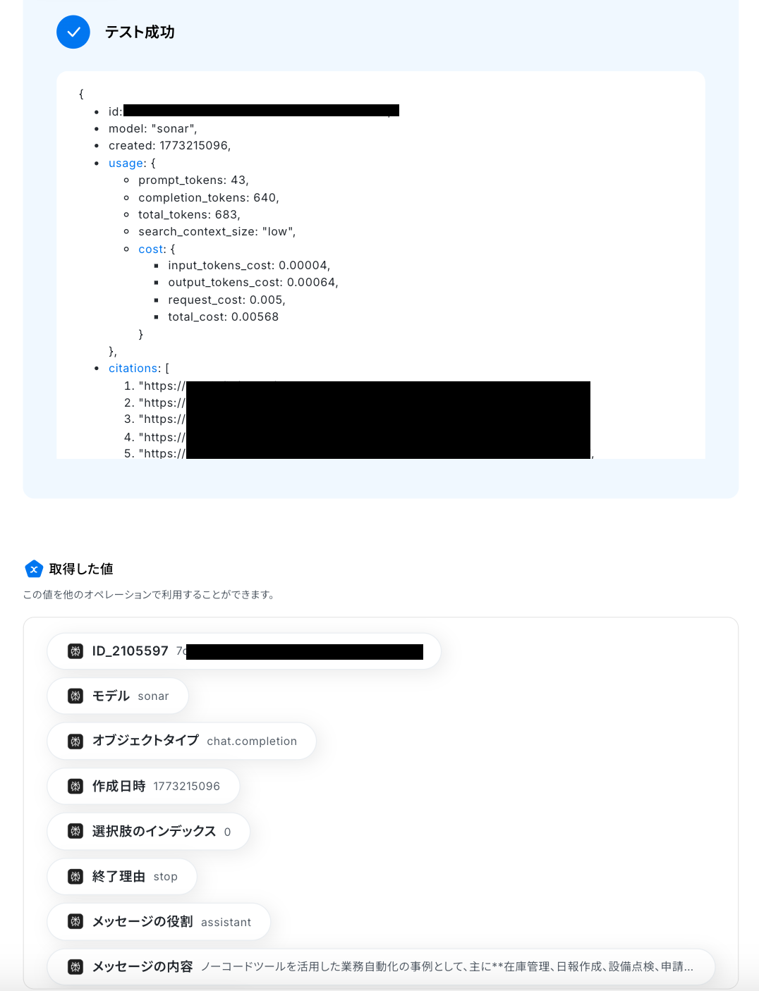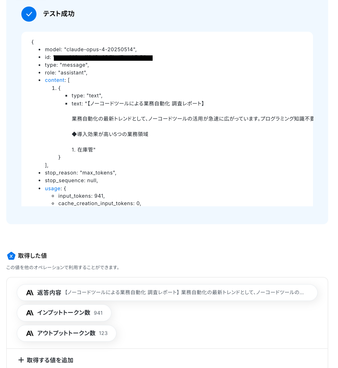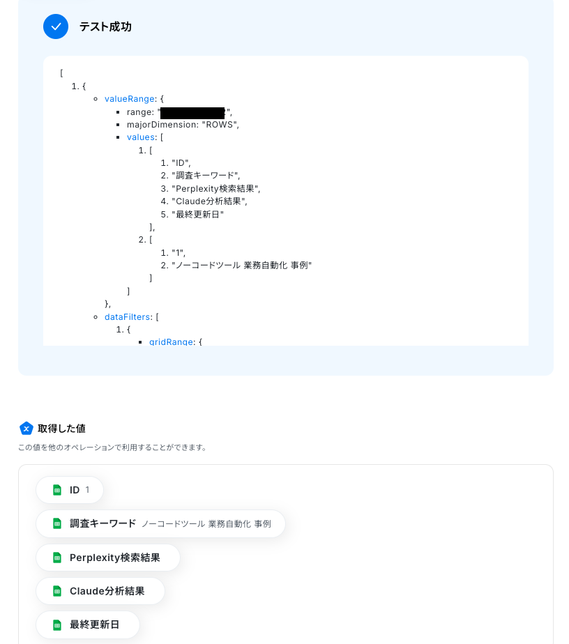 入力できたら、テストをクリックしましょう! テストに成功すると、取得した値を確認できます。※ 取得した値 とは? トリガーやオペレーション設定時に、「テスト」を実行して取得した値のことを指します。 後続のオペレーション設定時の値として利用でき、フローボットを起動する度に変動した値となります。