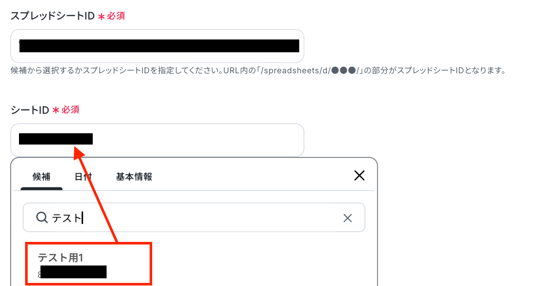 スプレッドシートID・シートID は、入力欄をクリックして表示される「候補」から選択してください。
