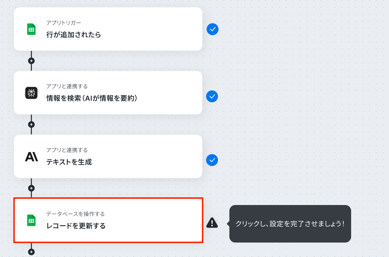 ステップ6:Google スプレッドシートのアクション設定 最後の設定です! ここでは、Google スプレッドシートのレコードを更新する設定を行います。 赤枠をクリックしましょう!
