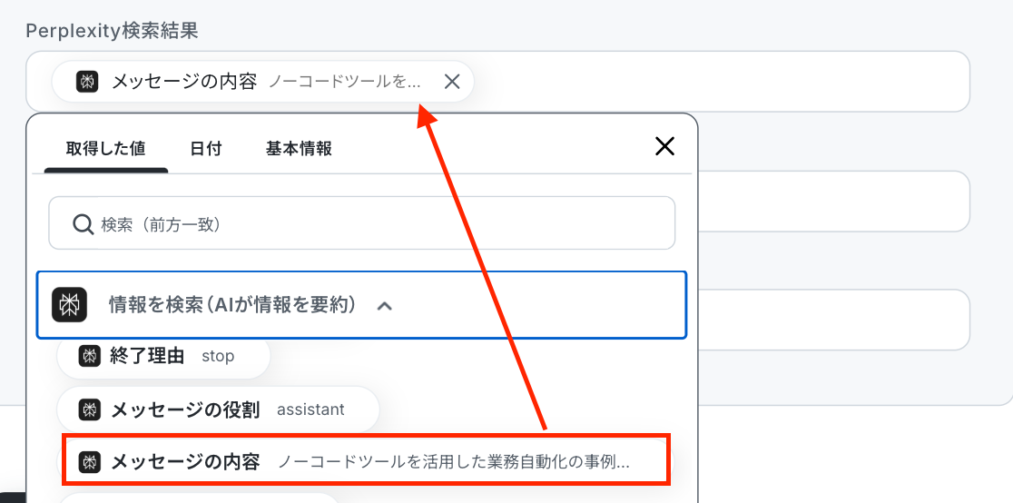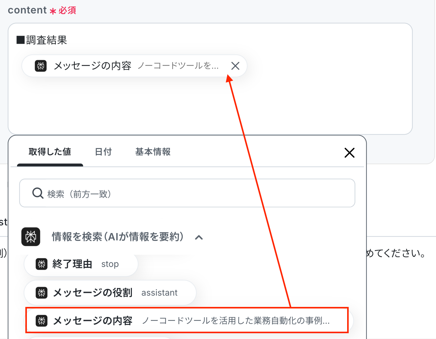 「content」には、前のステップで取得した値を引用して設定しましょう。 取得した値を活用することで値が固定化されず、フローボットを起動するたびに最新の情報を自動で反映できます。