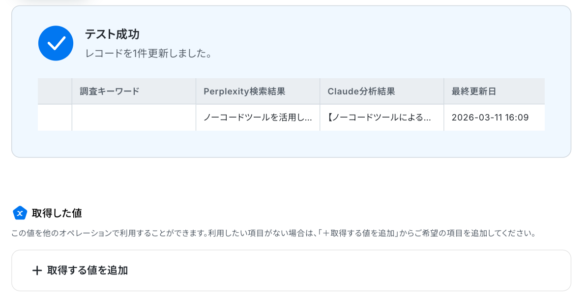 「更新したいレコードの値」 では、更新したい箇所のみ設定していきましょう! 「Perplexity検索結果」には、Perplexityのオペレーションで取得した値を設定します。