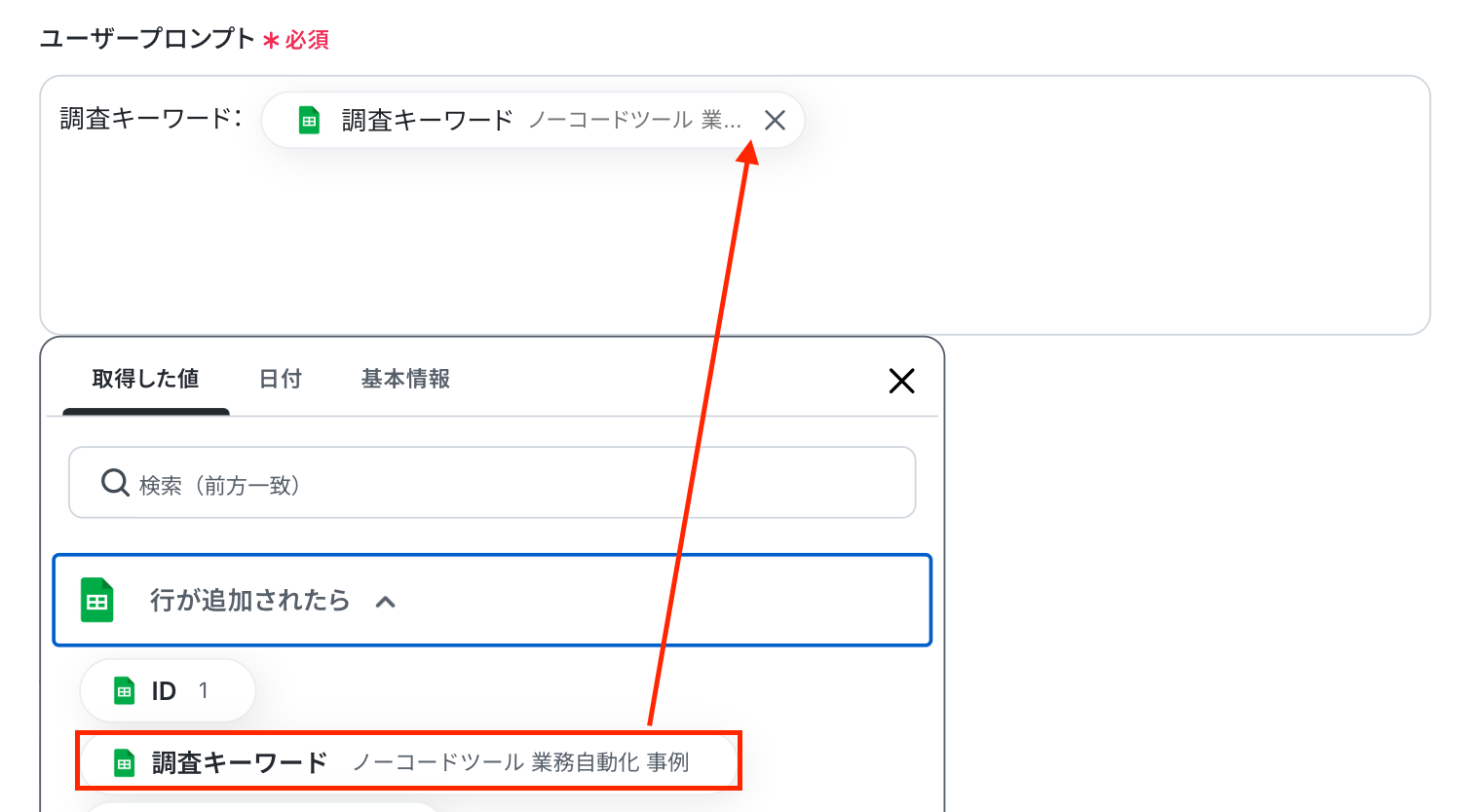 「ユーザープロンプト」 には、Google スプレッドシートのオペレーションで取得した値を引用して設定しましょう!【Tips】 取得した値を活用することで、フローボットを起動する度に変動する値として反映されます。 これにより、毎回変動する情報を手動で入力する必要がなくなり、効率的に連携できます!