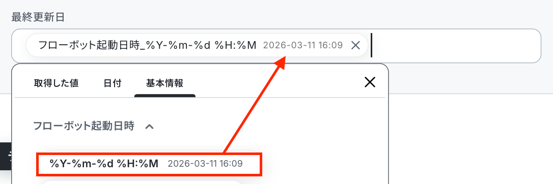 「最終更新日」は、「基本情報」→「フローボット起動日時」をクリックして設定してください。 このように設定することで、フローを起動した際に自動的に日時を反映させることができます。