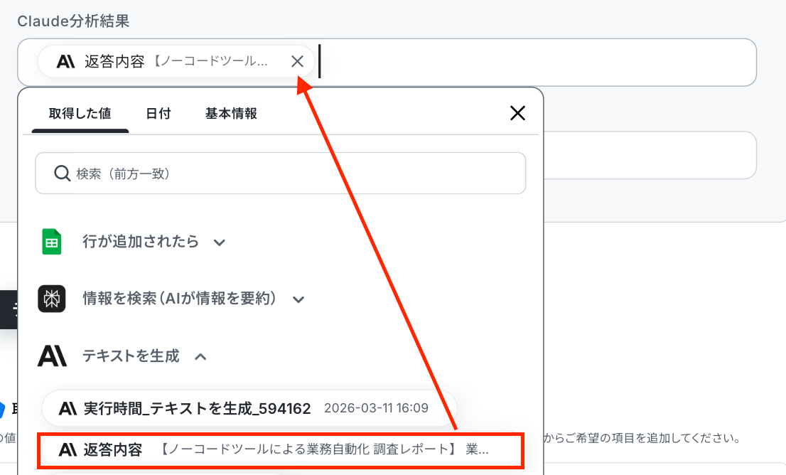「Claude分析結果」には、Claudeのオペレーションで取得した値を設定します。