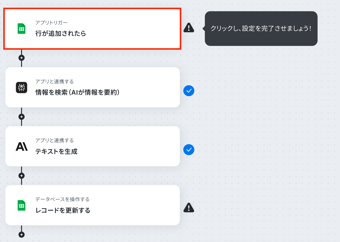 ここでは、Google スプレッドシートに行が追加されたら、PerplexityとAnthropic(Claude)で解析し結果を反映するフローボットを設定していきます。 赤枠をクリックしましょう! ※Google スプレッドシートをアプリトリガーとして使用する際の注意事項は「【アプリトリガー】Google スプレッドシートのトリガーにおける注意事項 」を参照してください。
