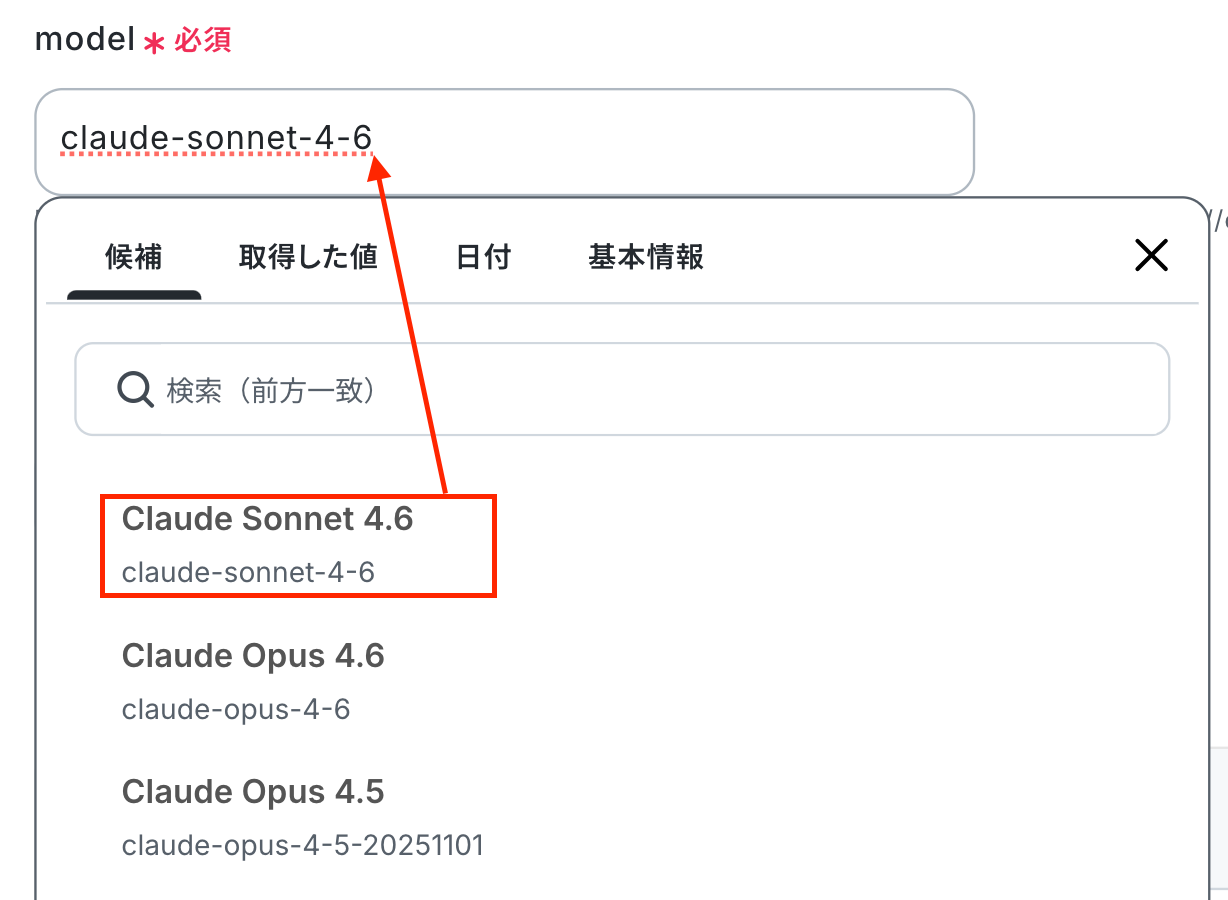 次の画面で、「model」を設定します。 連携が有効になっているアカウントが「候補」に表示されるので、任意のモデルを選択しましょう。