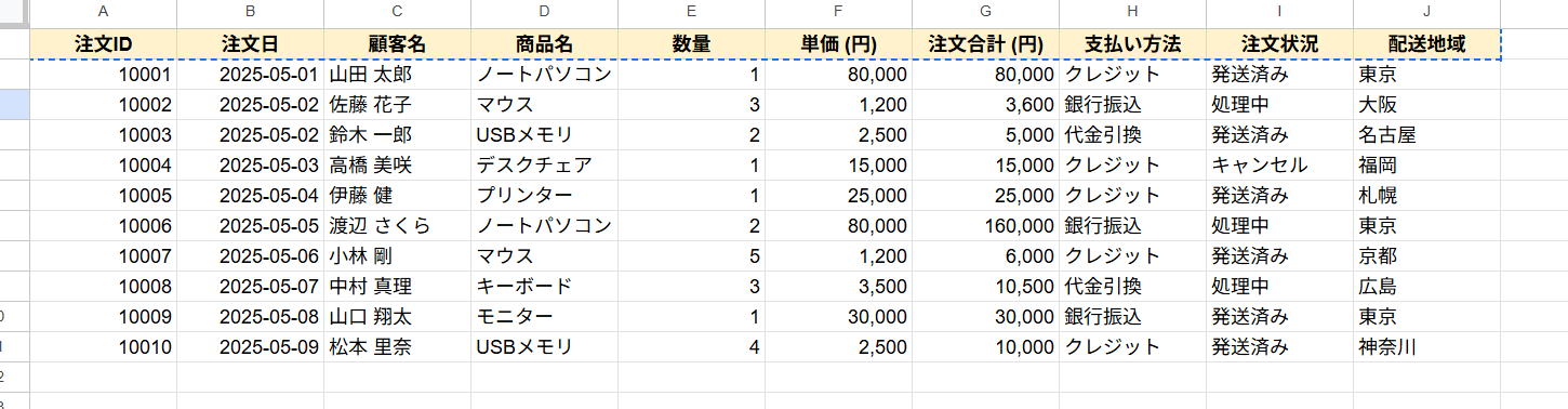 以下のような架空の生産管理シートを、簡易的に作成したので、この項目を入力しました。