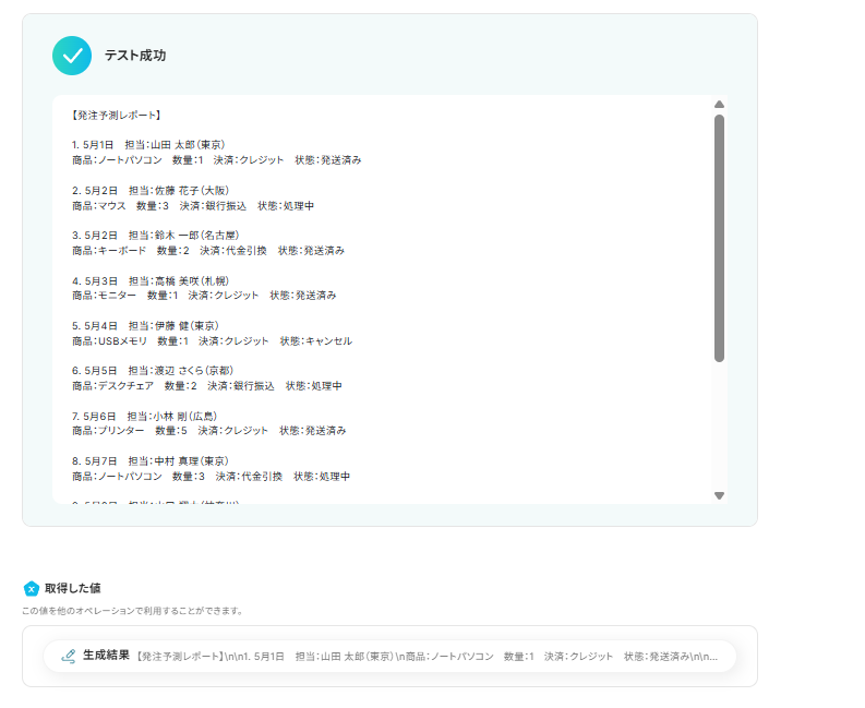 入力後、「テスト」をクリックし、実際に発注予測が生成されているか確認しましょう。