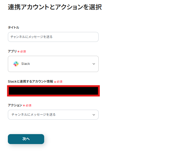 連携アカウントとアクションを選択する画面が表示されるので、今回連携するSlackのアカウントを確認し「次へ」をクリックします。