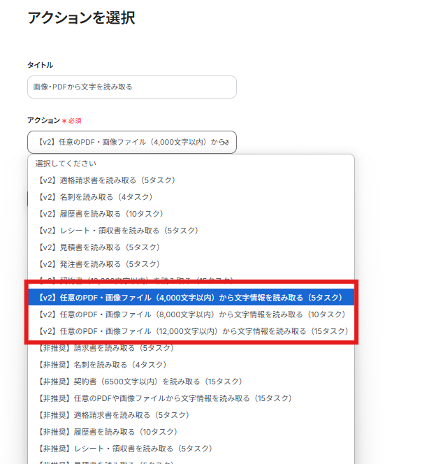 以下の画像のように、読み取る文字数によって使用するタスクが異なるため、任意のものを選択しましょう。