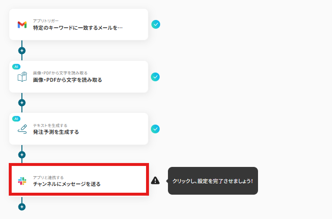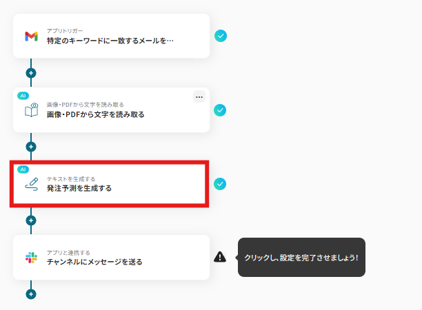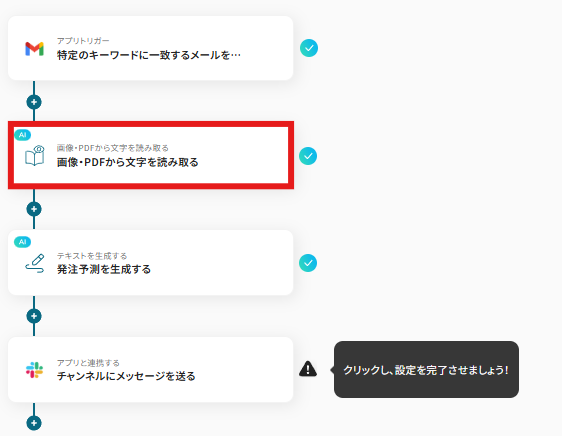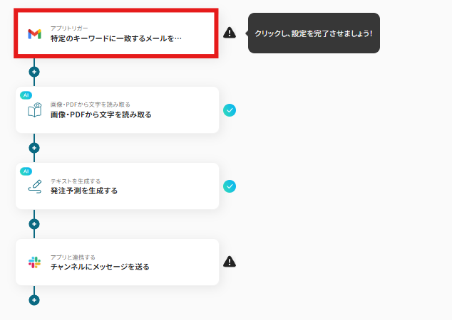 それではここから代表的な例として、Gmailで注文データファイルを受信した際に、その内容をOCRで読み取り、AIが生産管理を行い、結果をSlackに自動で通知するフローを解説していきます!