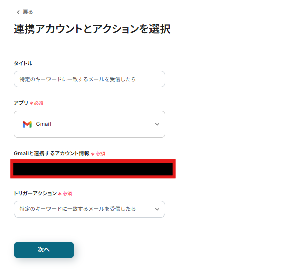 連携アカウントとアクションを選択する画面が表示されるので、今回連携するGmailのアカウントを確認し「次へ」をクリックします。