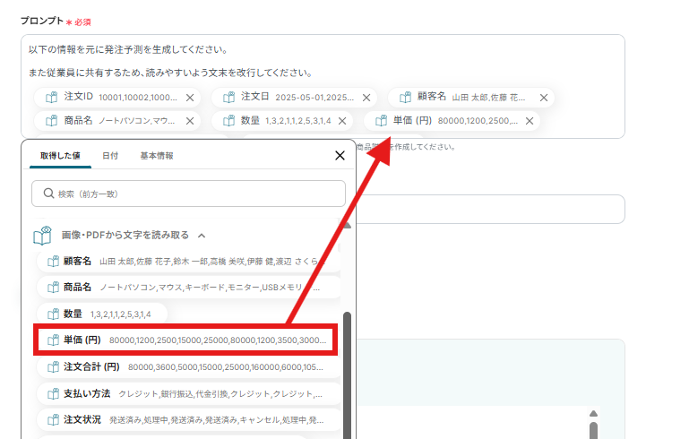 画像・PDFから取得した情報から、AIで発注予測を作成するための設定を行います。