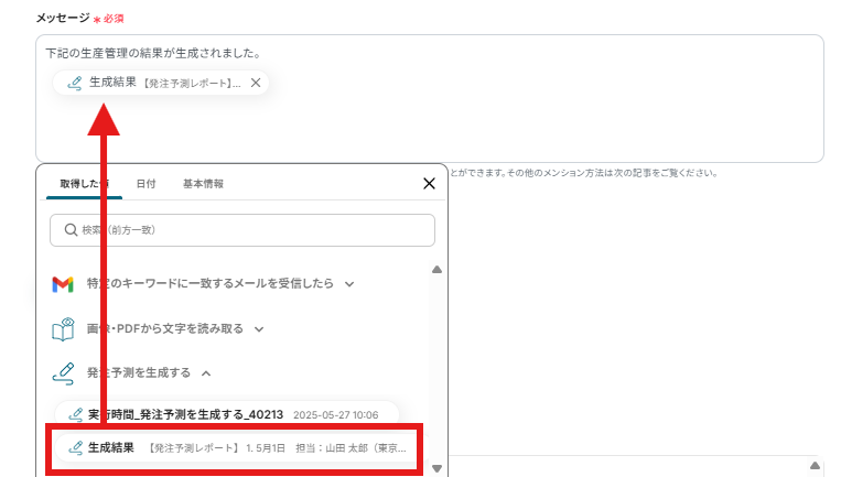 Gmailなどのメールツールで受信した注文データファイル等をトリガーに、OCRで情報を読み取り、AIが生産管理を行い、その結果をSlack等のチャットツールに自動で通知することができるので、受注情報に基づいた迅速な生産指示や進捗共有が可能になり、手作業による見落としや遅延を防ぎ、生産プロセスのスムーズな連携を実現します!