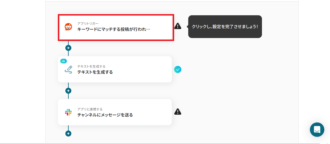 - Redditのトリガー設定、AI・Slackのアクション設定