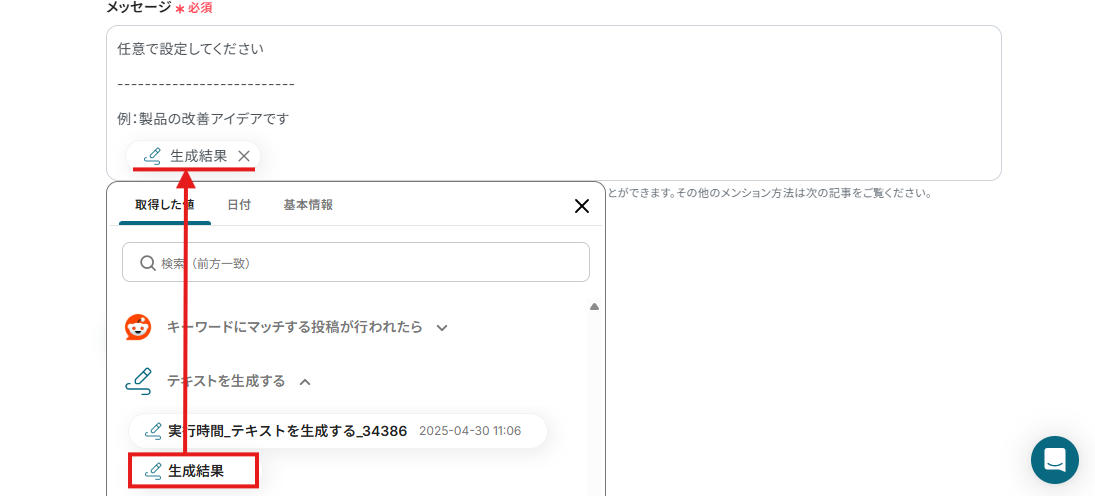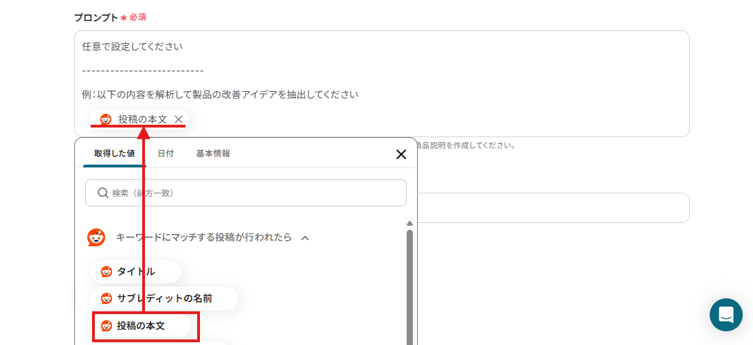 この設定では、Redditに先ほど設定したキーワードを含む投稿があったら「投稿の本文」を自動で引用し、製品の改善アイデアを抽出することができますよ!