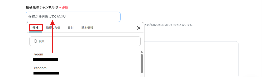 投稿先のチャンネルIDは、枠内をクリックし表示される候補から設定してください。