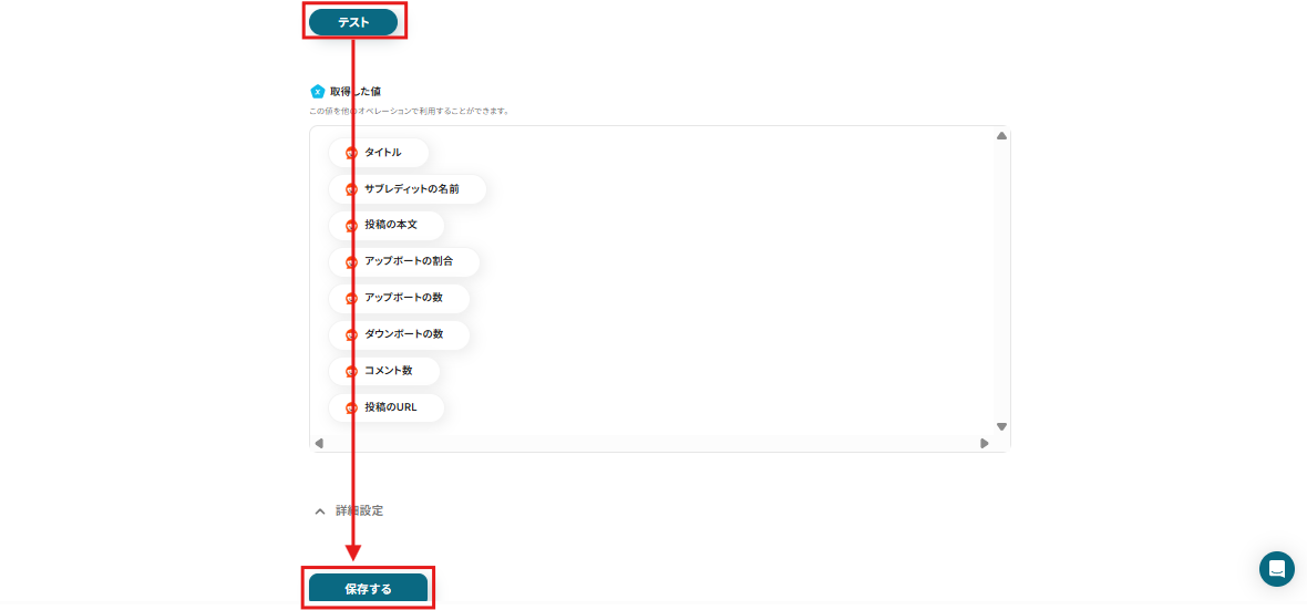 テストが成功したら先ほどRedditに投稿した情報がアウトプットとして取得されるので確認し、設定を保存しましょう。