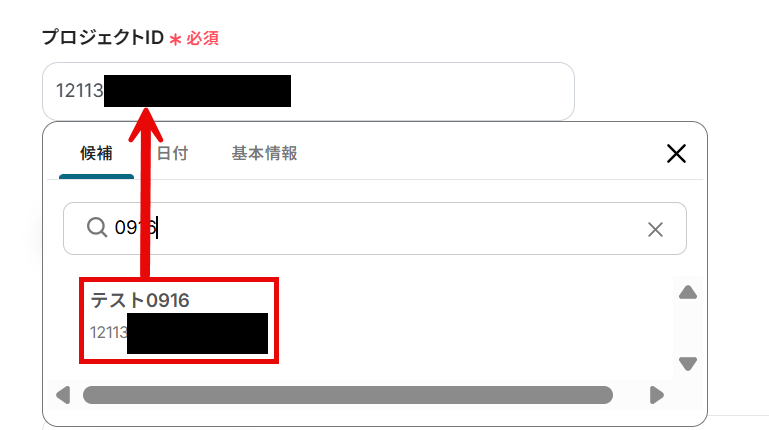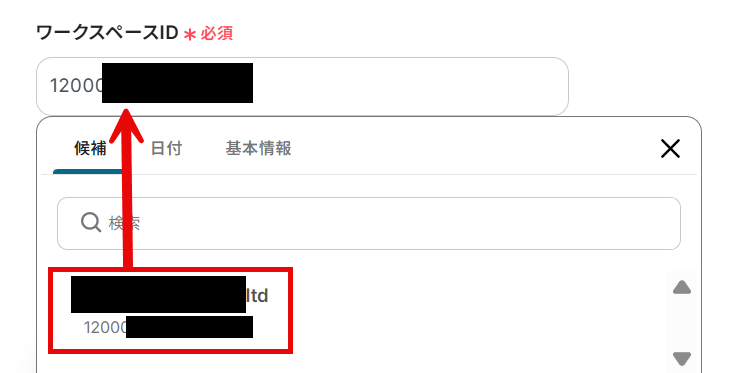ワークスペースIDとプロジェクトIDは、それぞれフィールドをクリックし、候補からIDを選択します。