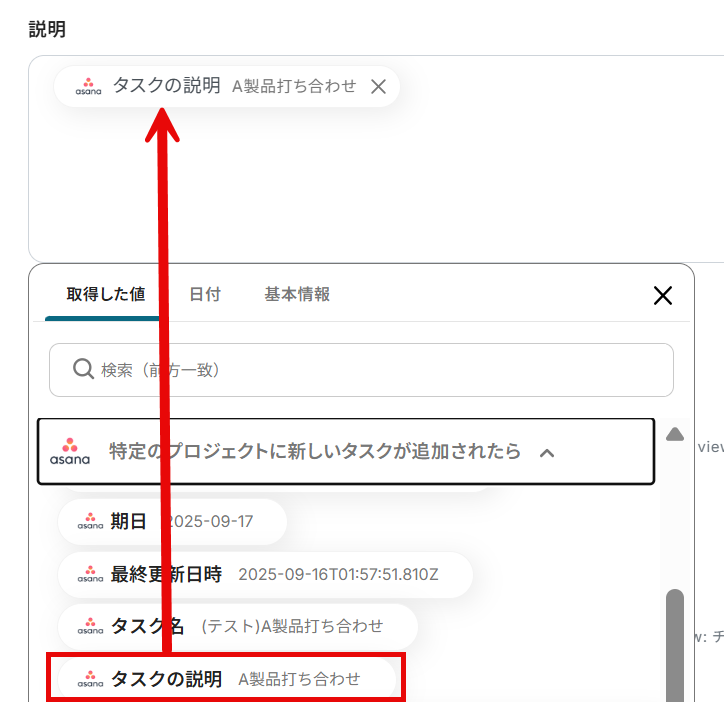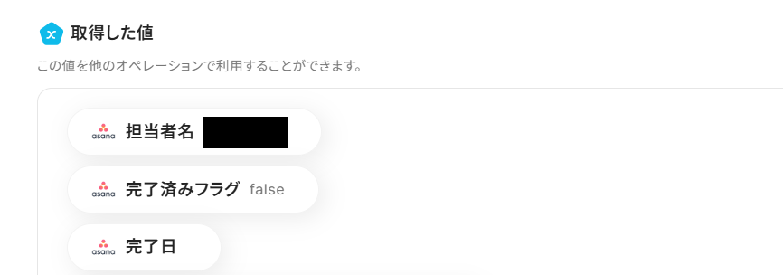 この時、「←Asanaのアウトプットを設定してください」という一文は削除してください。