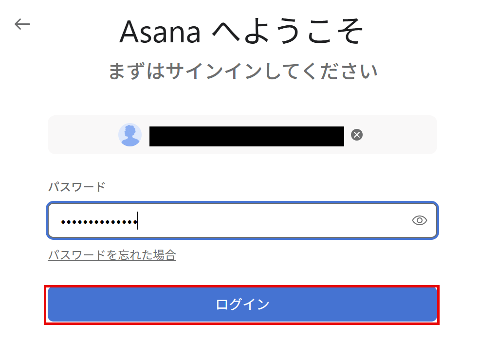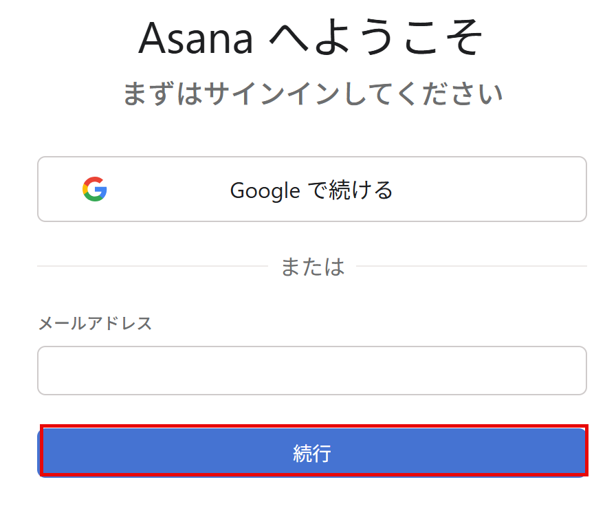 以下の画面で、Asanaのログインメールアドレスを入力し、「続行」をクリックします。
