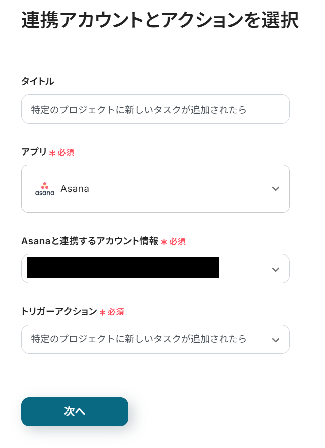 - トリガーアクション:Asanaで特定のプロジェクトに新しいタスクが追加されたら起動します。