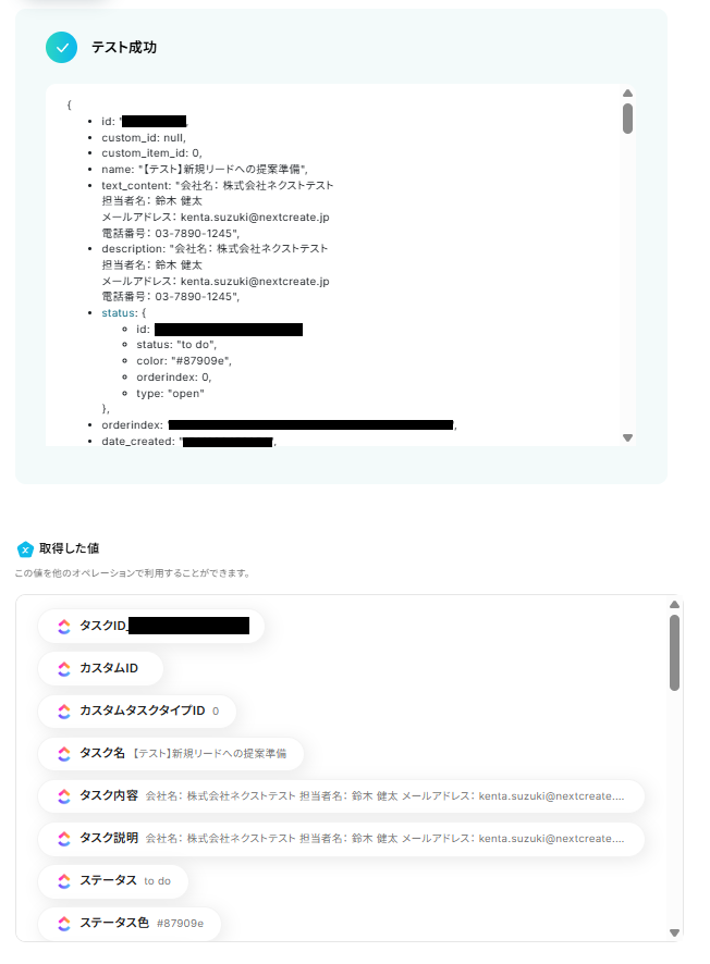 テストに成功すると、タスクの情報が取得されます。