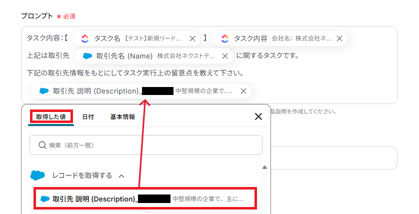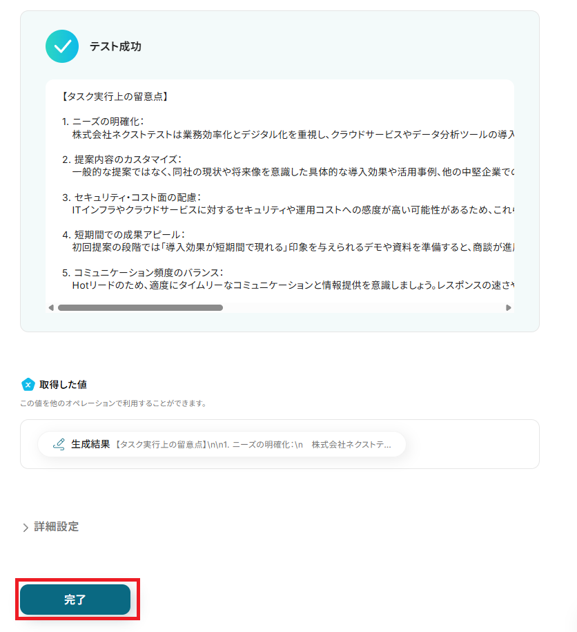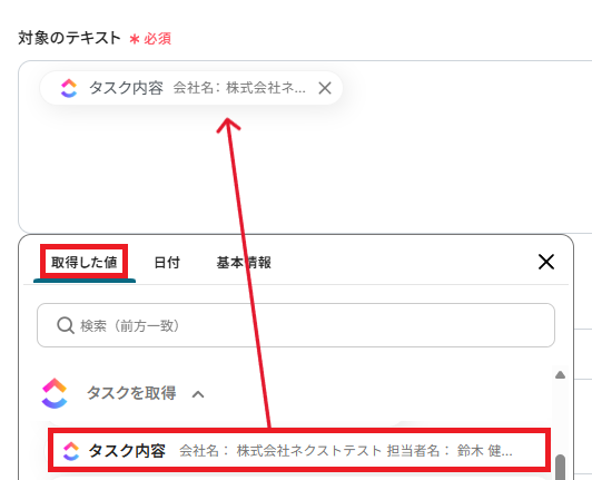 「対象のテキスト」は、取得した値からAIに抽出させるテキストを設定しましょう。
