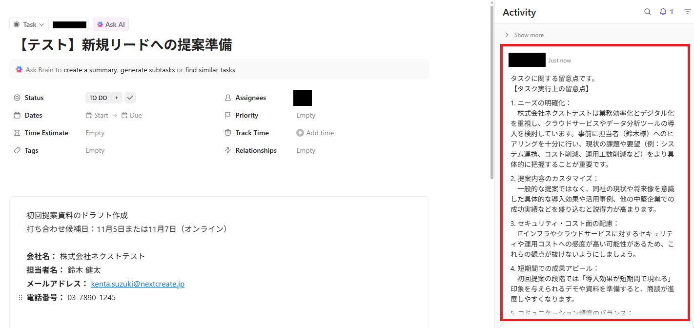 ClickUpでタスクが作成されたら、Salesforceの関連情報をAI分析してコメントに自動追加する