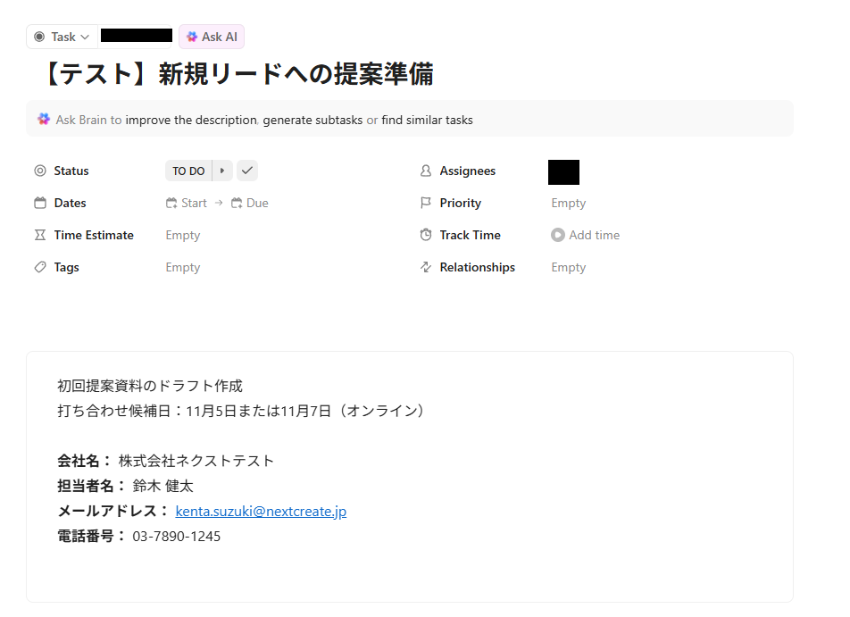 作成するタスクの内容は、テスト用のため架空の情報(「テスト会議」や「テスト太郎」など)でOKです。