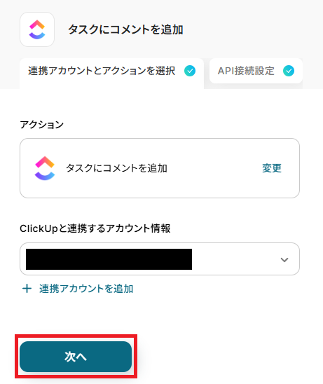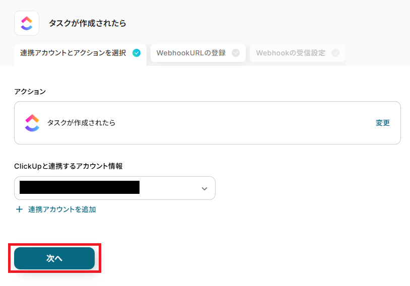再度、ClickUpと連携するアカウントに間違いがないかを確認し、「次へ」をクリックしましょう。