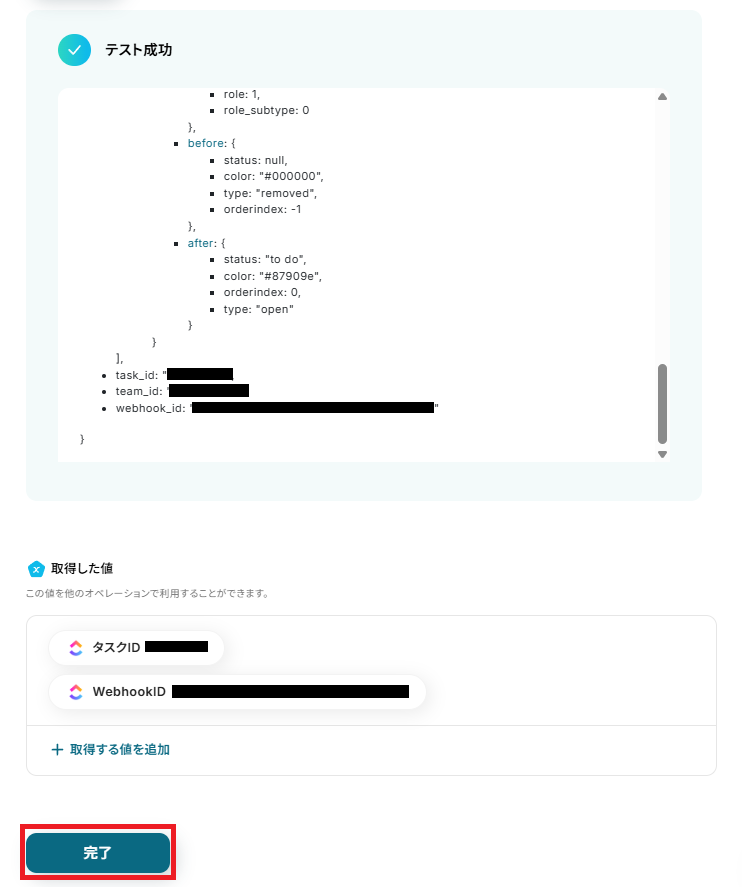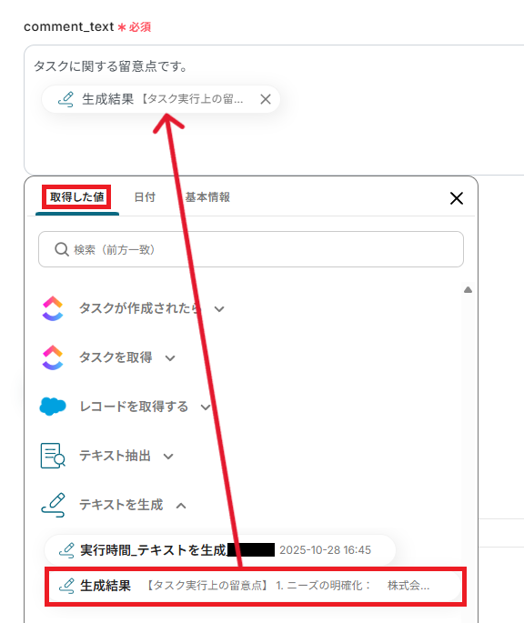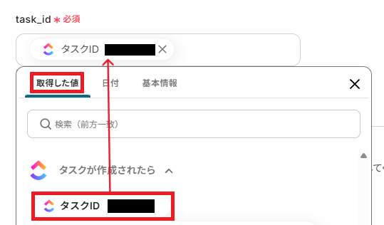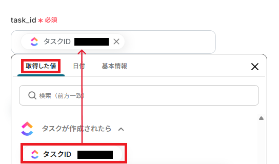「task_id」は、入力欄をクリックして表示される取得した値から選択してください。