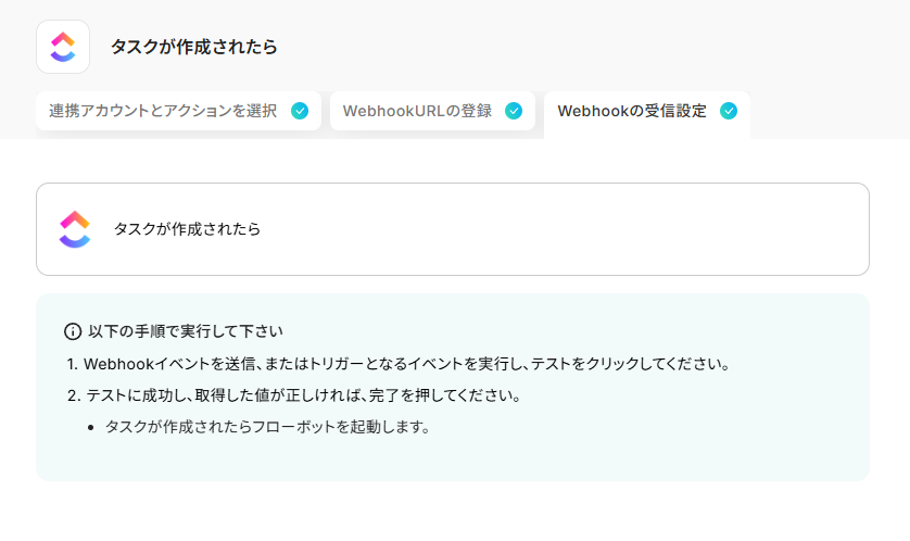 以下の画面に移行するので、トリガーとなるイベント(タスクの作成)を実行しましょう。