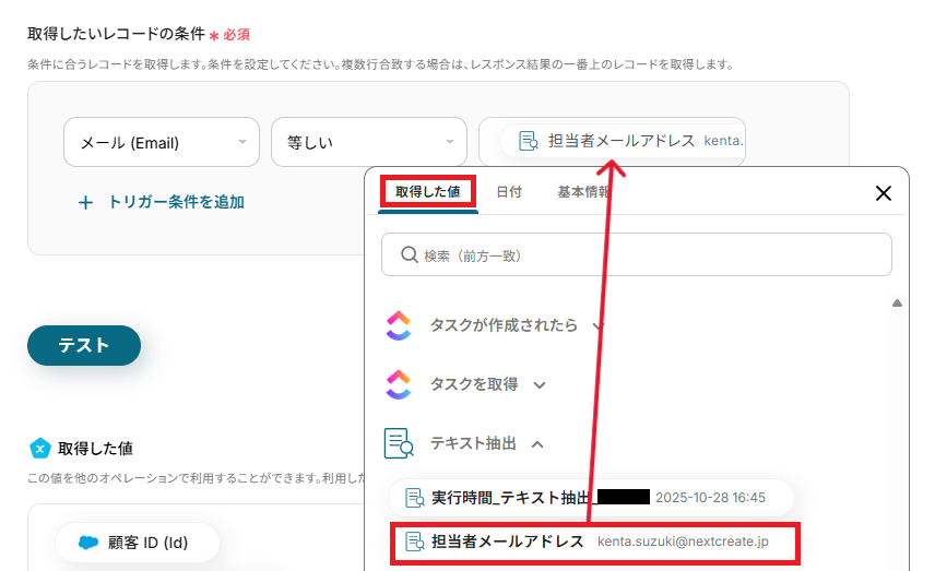 今回は【担当者メールアドレス】を抽出するよう設定しました。