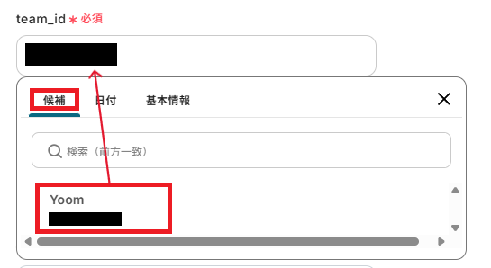 「team_id」を、入力欄をクリックして表示される候補から選択してください。