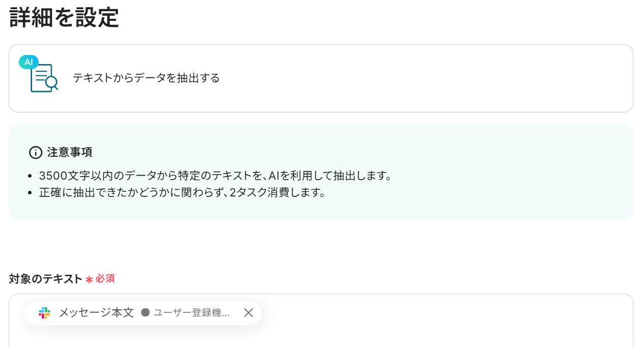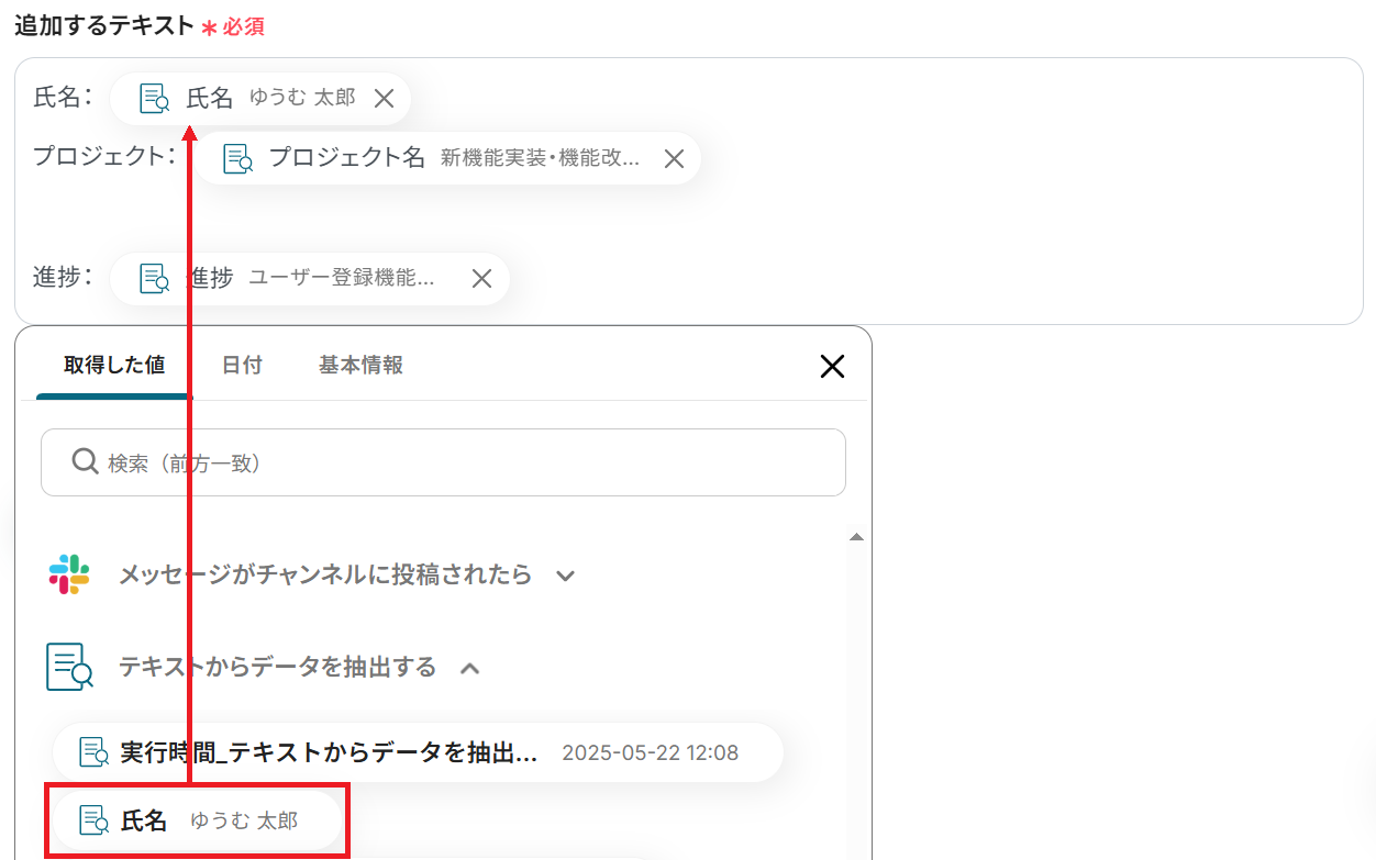ステップ4で取得したアウトプットを利用して設定すると、抽出した内容を反映させることができます。
