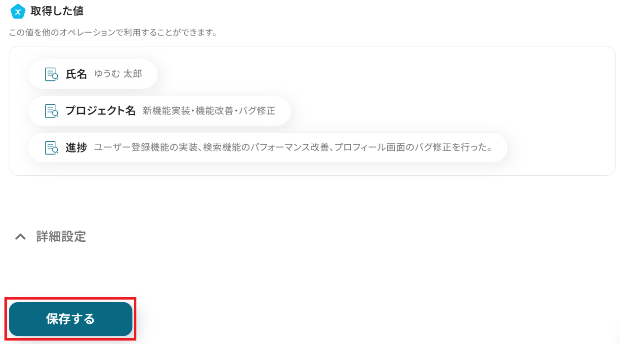 成功したら保存します。AIがSlackの投稿内容を抽出してくれました!