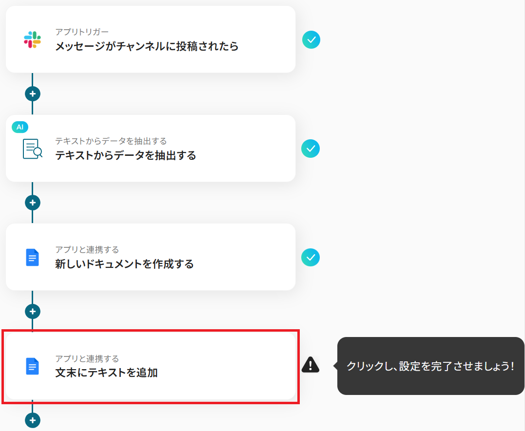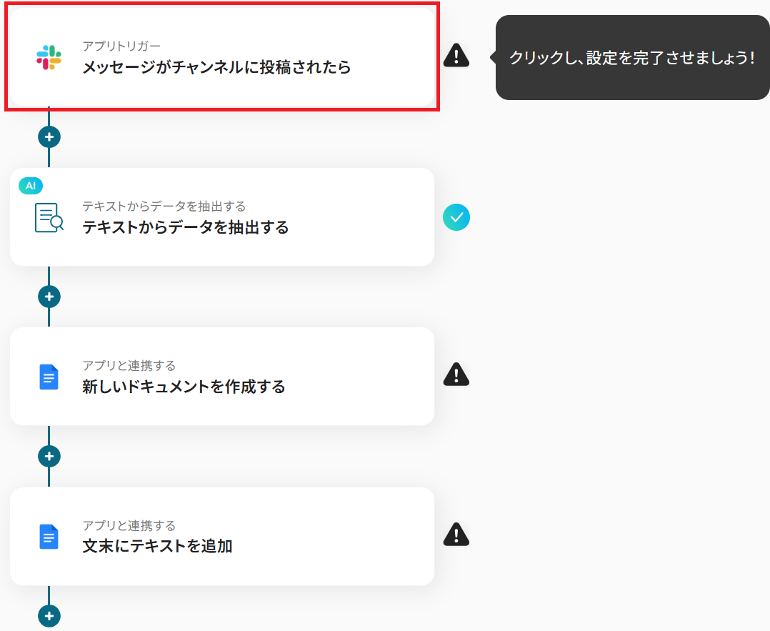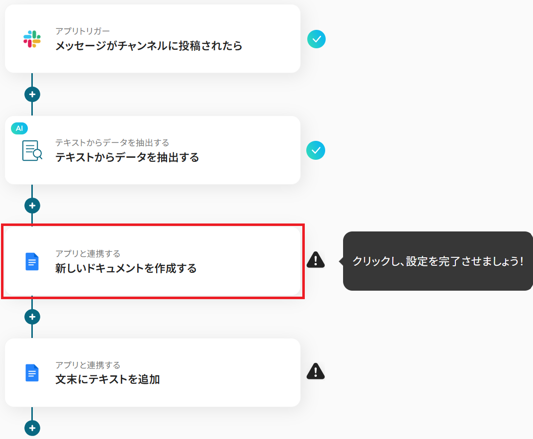 それではここから代表的な例として、Slackでメッセージが投稿された際に、その内容をAIが解析・抽出してGoogleドキュメントに自動で書類を作成するフローを解説していきます!
