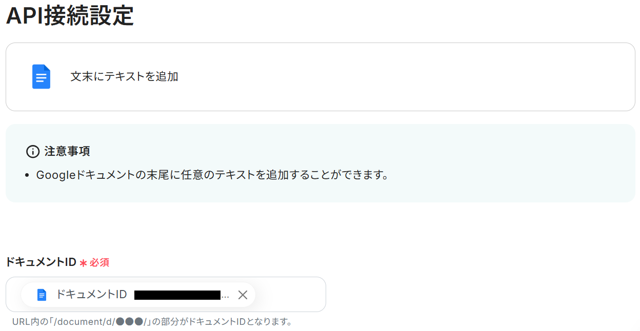 API接続設定に移るので、ドキュメントのタイトルを下記のように設定してテストしましょう。