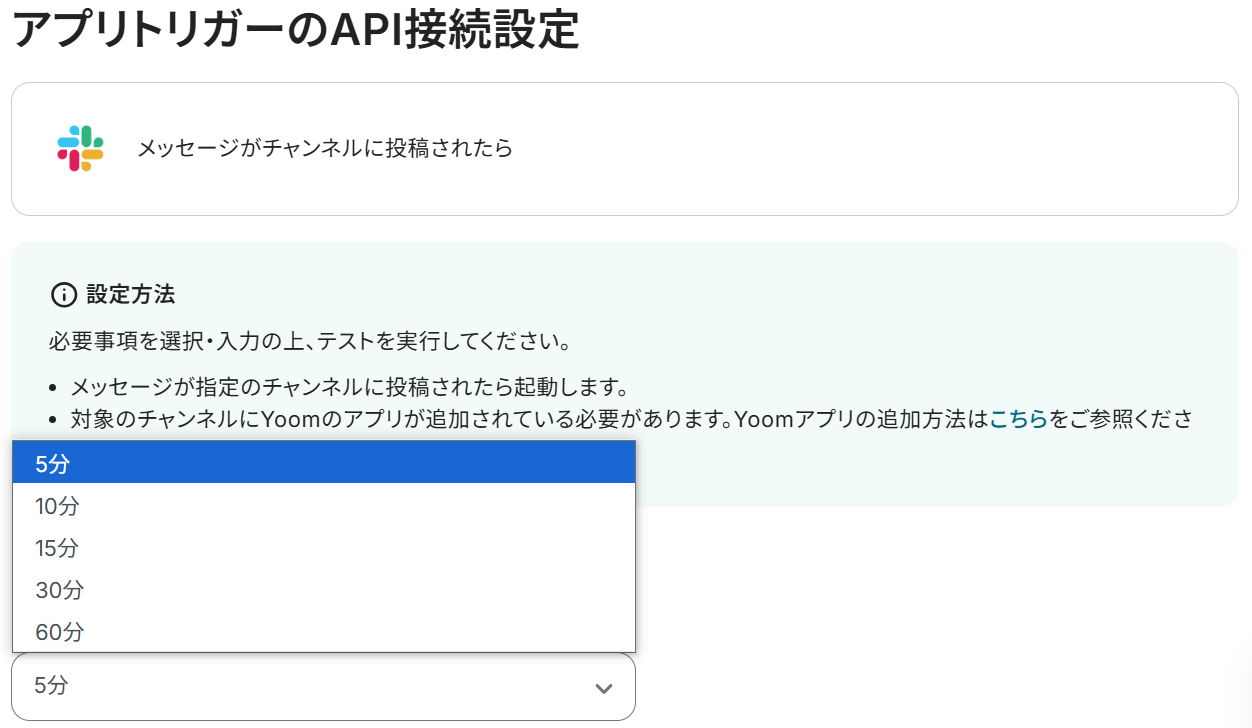 アプリトリガーのAPI接続設定という画面が表示されるので、まずトリガーの起動間隔をプルダウンから選択しましょう。