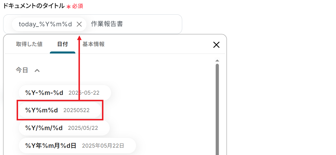 今回は日付のプルダウンから「今日」の値を選択し「当日の日付 作業報告書」となるように設定しました。