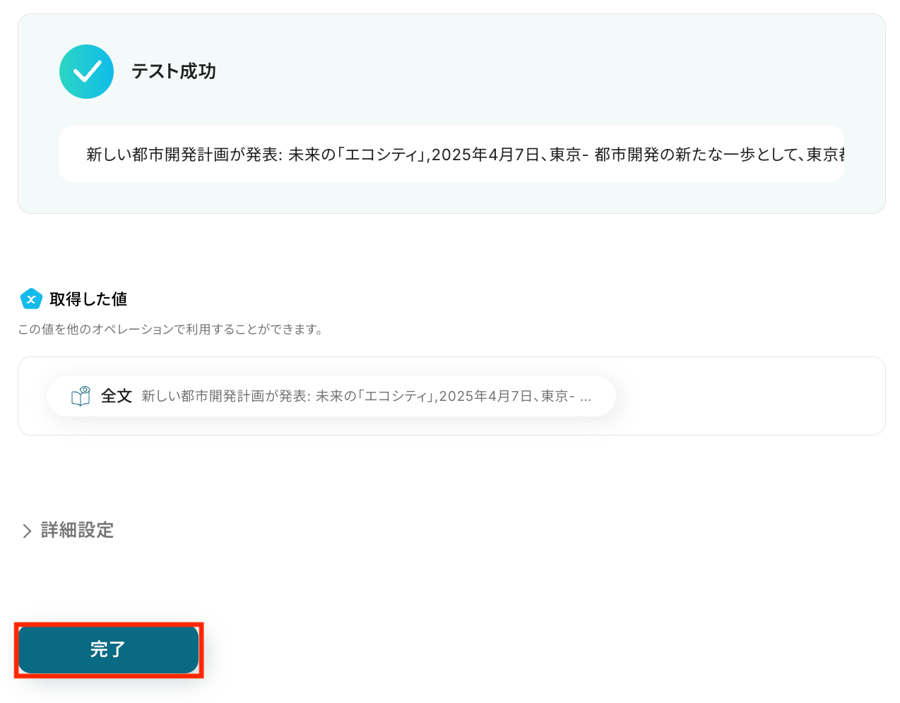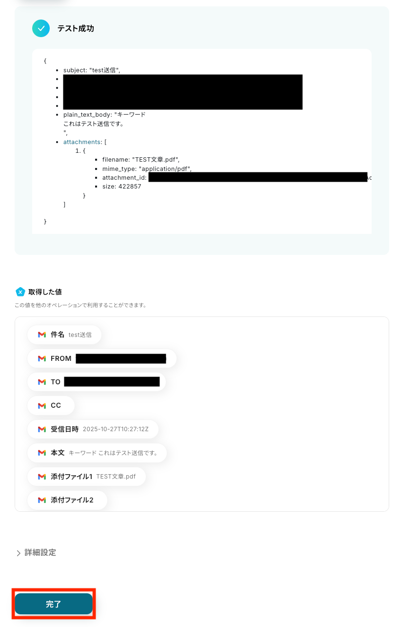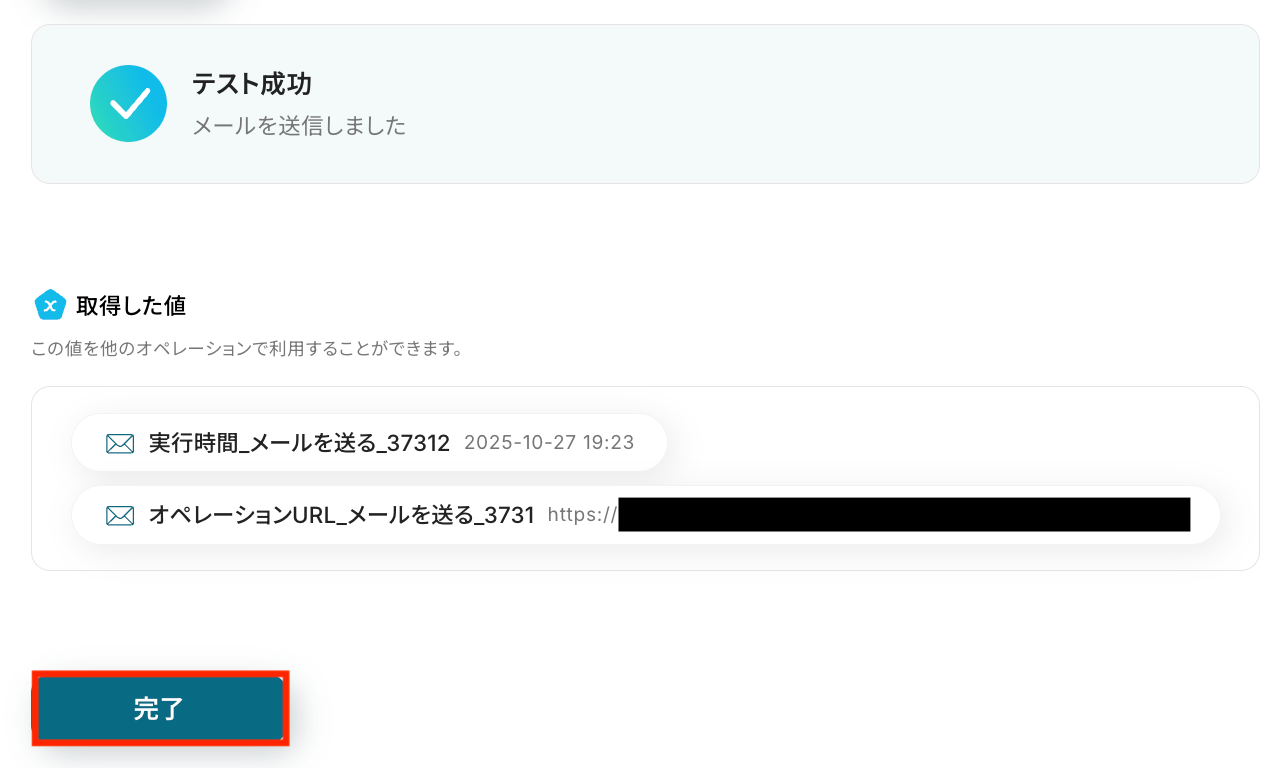 この取得した値を活用して、後続のメール送信アクションへ差し込み可能です。