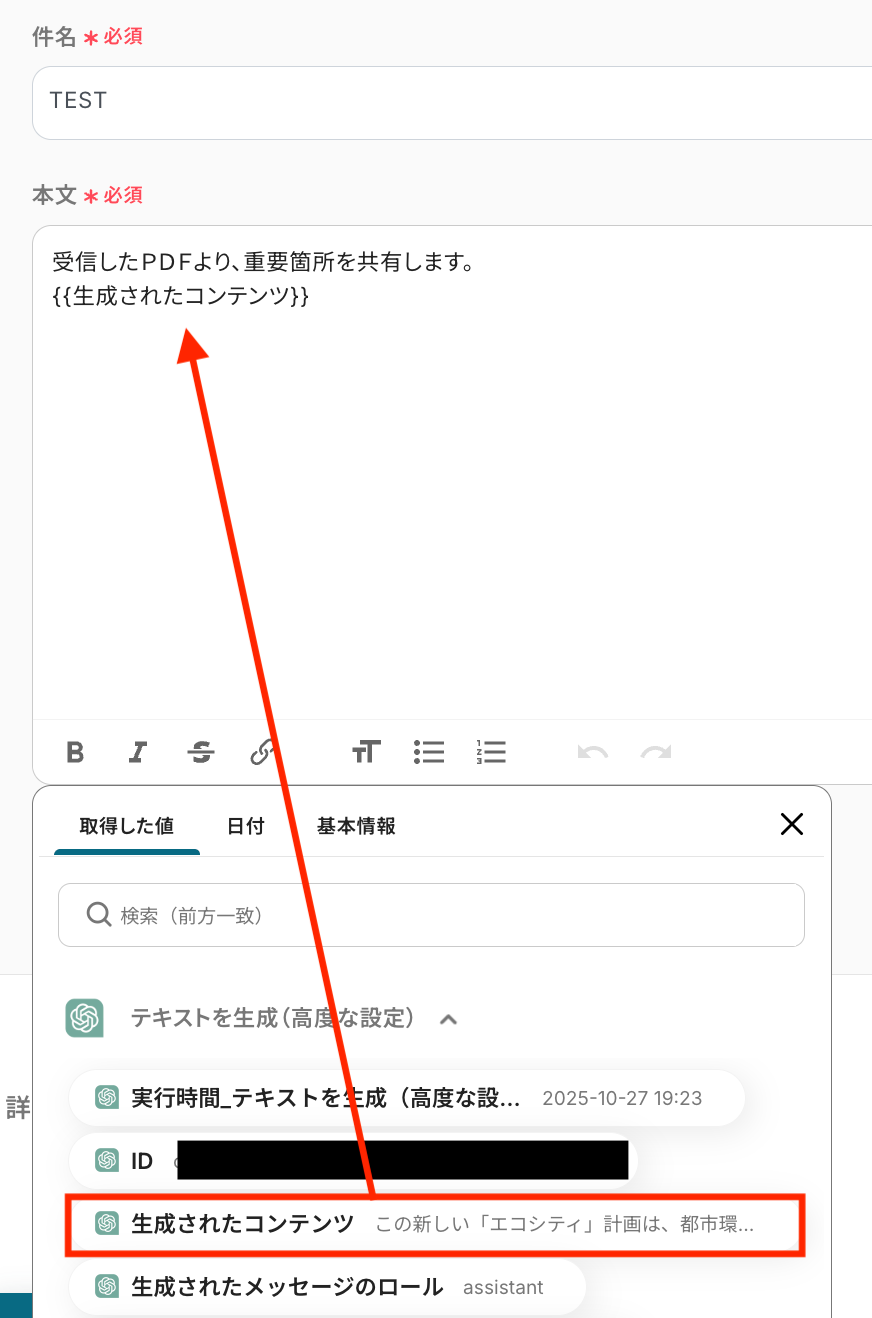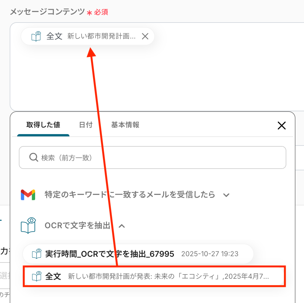 続いて、メッセージコンテンツにOCRで取得した値の「全文」を選びます。