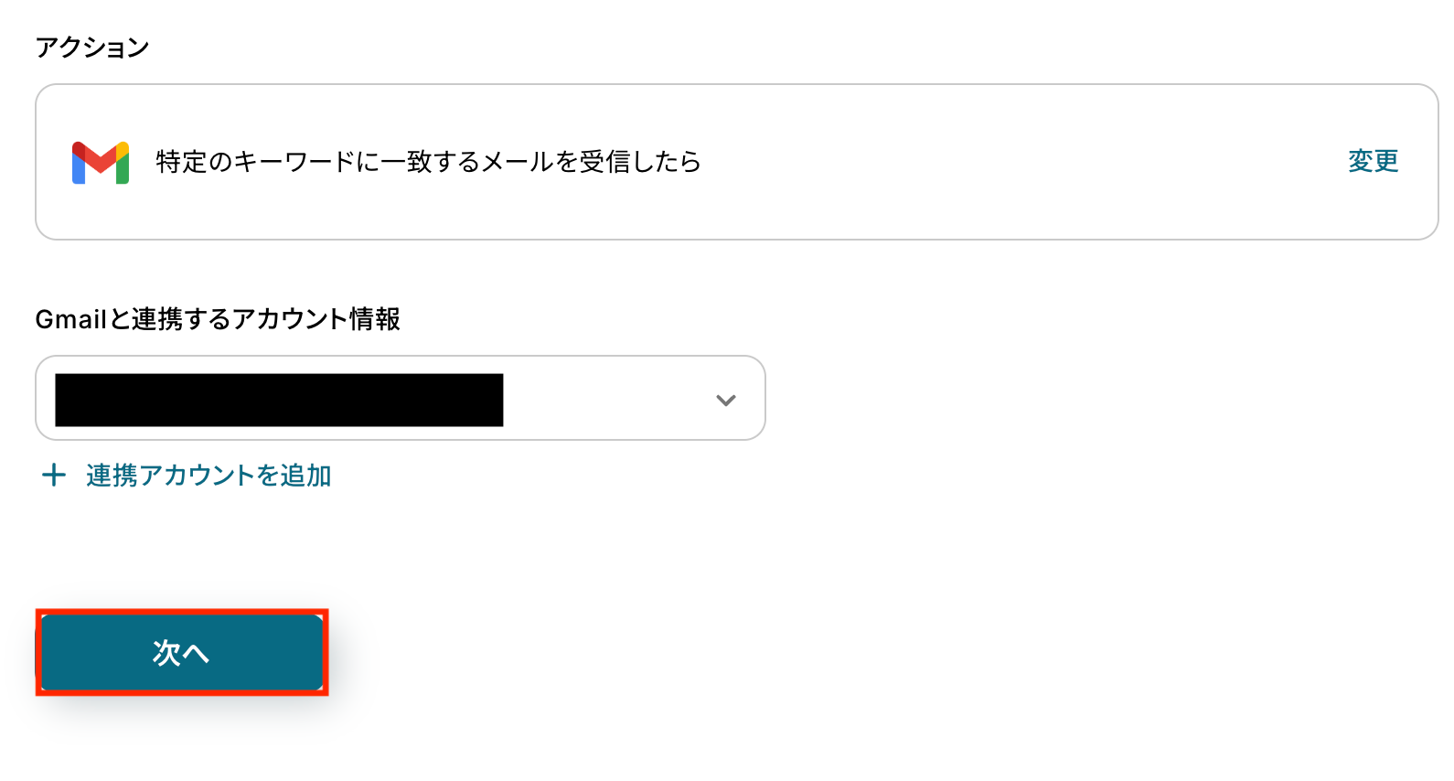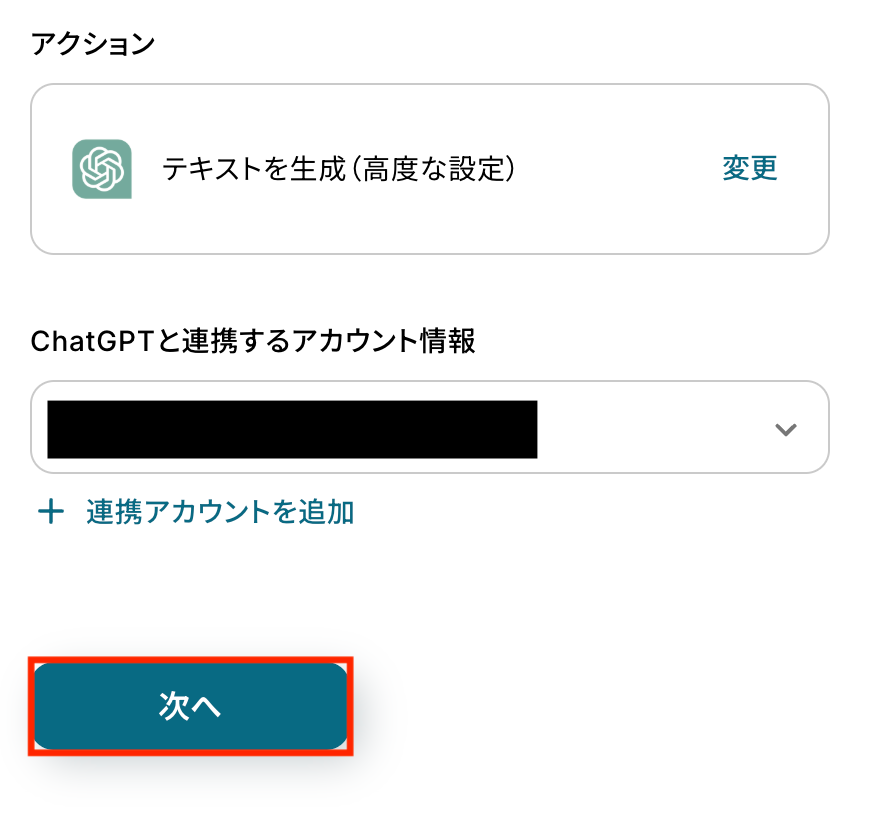 アクションとアカウント情報は先ほどと同様に、修正・確認をして次に進んでください。