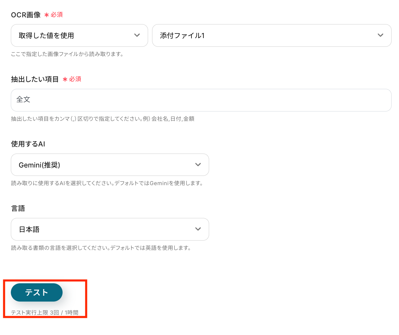 OCR画像は「取得した値を使用」と「添付ファイル1」を選びましょう。